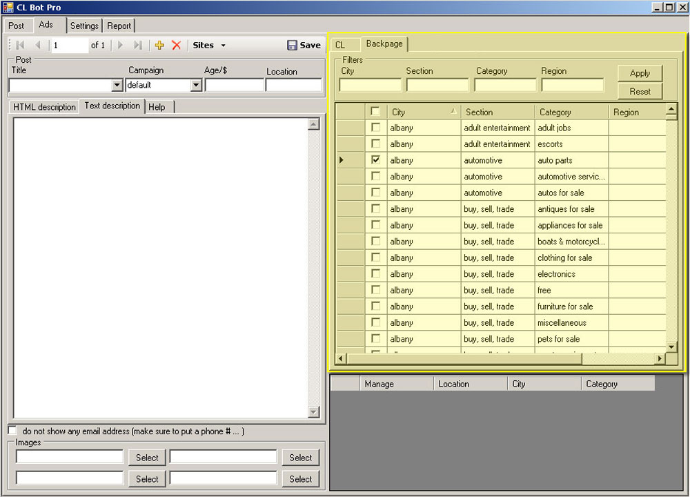 You can select Backpage cities and categoires under Backpage tab. It is under Ads tab. You can post the same ad both on craigslist and backpage. See here about posting order. - Input !bp{Yes} keyword in the options column under Account tab if you are using backpage account with CL auto poster. The New Re-Captcha Multi-Image bypass module is also available for Backpage.com. For a Frequently Asked Questions of the backpage addon, click here. For a screenshot of the backpage addon, click here. If you already own the base software then you can order this addon directly. Order the Backpage Add On